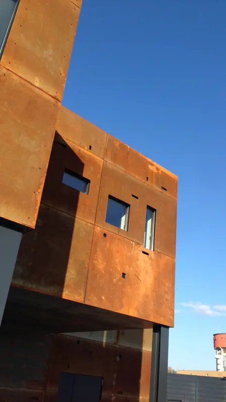 I genbrugsstationens centrum ligger der en bygning, som forestiller flere containere, der er stillet ovenpå hinanden.